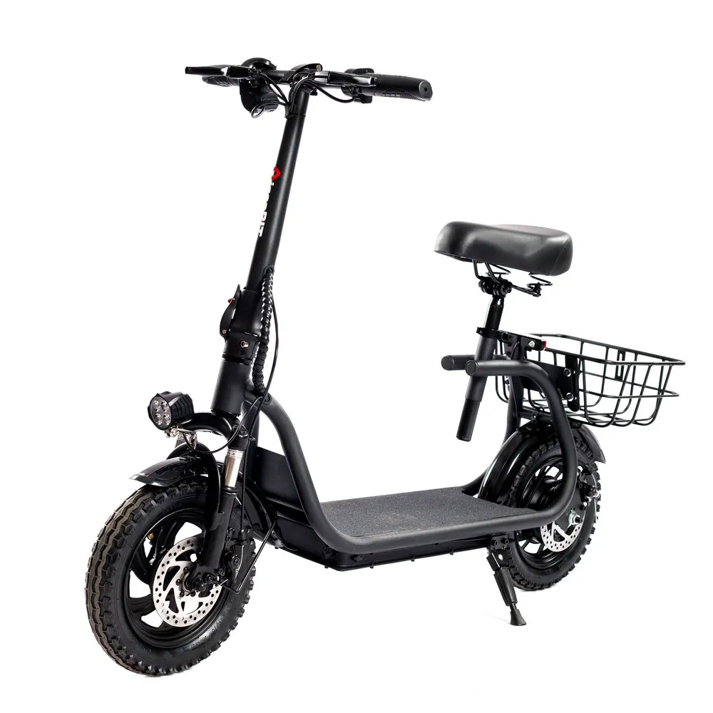 Электрический самокат iconBIT Trident 129T Pro создан для комфортных и длительных поездок. Это подтверждается его большими резиновыми колёсами с литыми дисками и широким и мягким седлом. Седло регулируется по высоте, что делает самокат универсальным, а пружинные амортизаторы, расположенные сразу под посадочным местом, обрабатывают любые неровности на дороге и уменьшают нагрузку на спину пассажира. Также проезжать все преграды на пути помогает амортизационная вилка самоката. Компактно хранить и транспортировать электросамокат позволяет его складная конструкция.