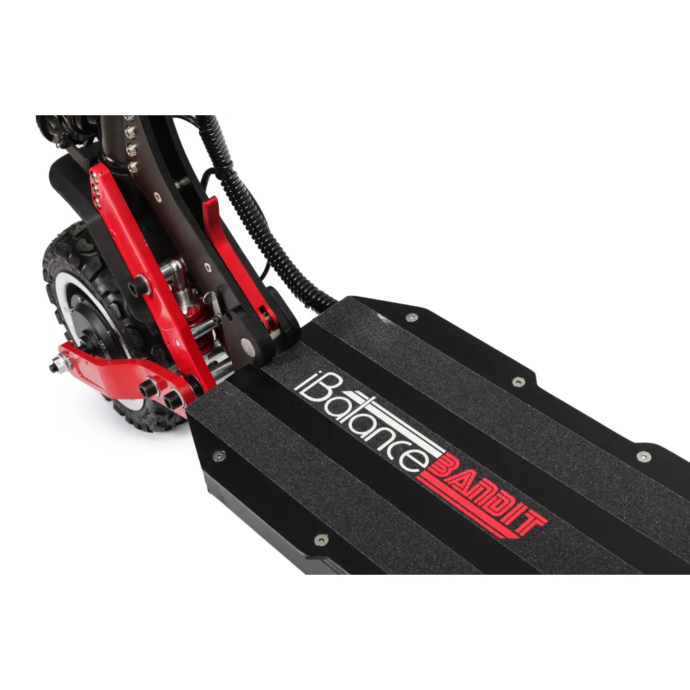 Электросамокат iBalance Bandit мощный полноприводный агрегат, который подойдет для передвижения по любому бездорожью. Прочная массивная конструкция вызывает доверие, максимальная нагрузка на устройство 150 кг. С усиленной амортизацией передних и задних колес электросамокат имеет плавный ход даже по гравийной дороге. Колеса диаметром 11 дюймов, с протекторными внедорожными шинами. В комплекте идут запасные шоссейные шины.