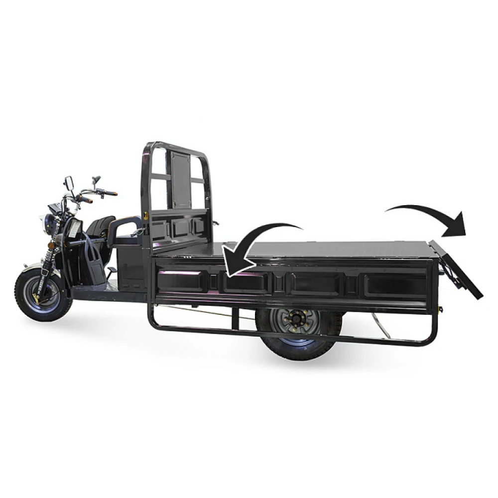 Электротрицикл оборудован гидравлической тормозной системой и амортизаторами, обеспечивающими плавность движение и отсутствие проблемой с преодолением препятствий. Транспорт имеет гарантию производителя (1 год).